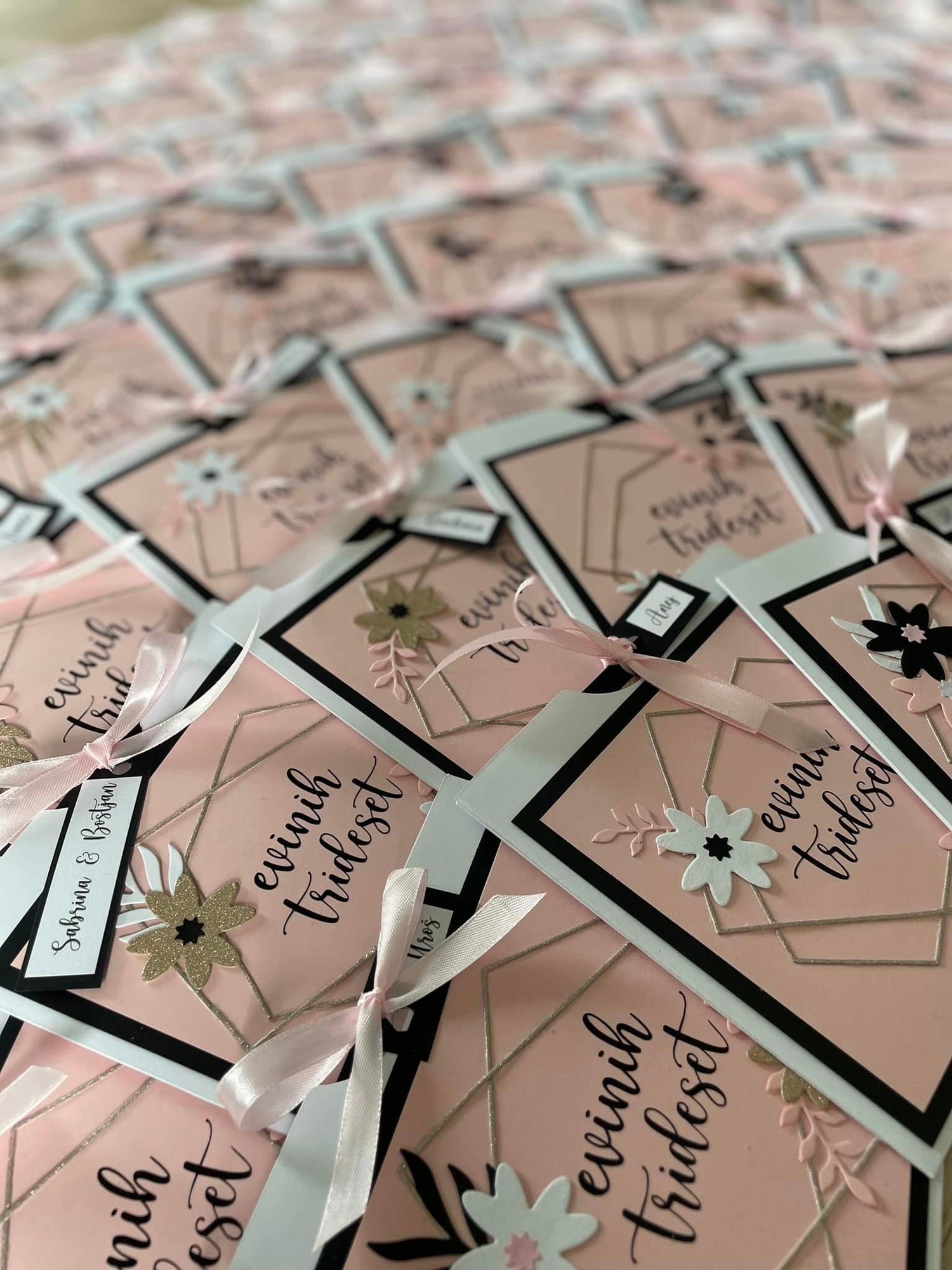 Naročilo papirnatih izdelkov morate oddati vsaj 14 dni pred dogodkom, z izjemo količinsko večjih izdelkov (vabila, sedežni redi, škatlice zahvale...), ki jih je potrebno naročiti vsaj 1 mesec pred dogodkom. Naročilo velja kot potrjeno, ko plačate akontacijo v višini 30% vašega naročila na naš transakcijski račun.